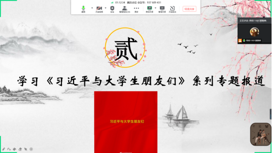此次团会以线上形式,组织同学们学习“百生讲坛”省级优秀主讲人和活力团支的相关材料;观看《中国青年报》刊发的《习近平与大学生朋友们》系列专题报道,并展开以“我为什么入党?”为主题的研讨,让同学们领会和贯彻落实习近平总书记新时代中国特色社会主义的思想,引发同学们对入党的思考和自我探寻入党的初心。最后主持人宣读“百生讲坛”赛事规则,并鼓励同学们积极报名参加。