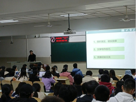 大会伊始,由极客班学生导员张优介绍本次会议的主讲人。大会第一部分由张智亮主讲,他持有多项专利,参加过诸多比赛并取得优异成绩。他首先给同学们提出殷切期望,希望同学们无论是工作还是读研,都要做到厚积薄发、踏实做事。接着,他向同学们介绍了四种写作技巧,并强调在写作过程中要做到简明扼要,学会运用书面化表达。同学们积极性颇高,主动学习并记录。最后,张智亮同学从论文专业比赛、项目创新比赛两方面向我们分享了竞赛经验。他指出,要针对各个方面的评委,多角度解释核心技术,并学会突出亮点,隐藏弱点。