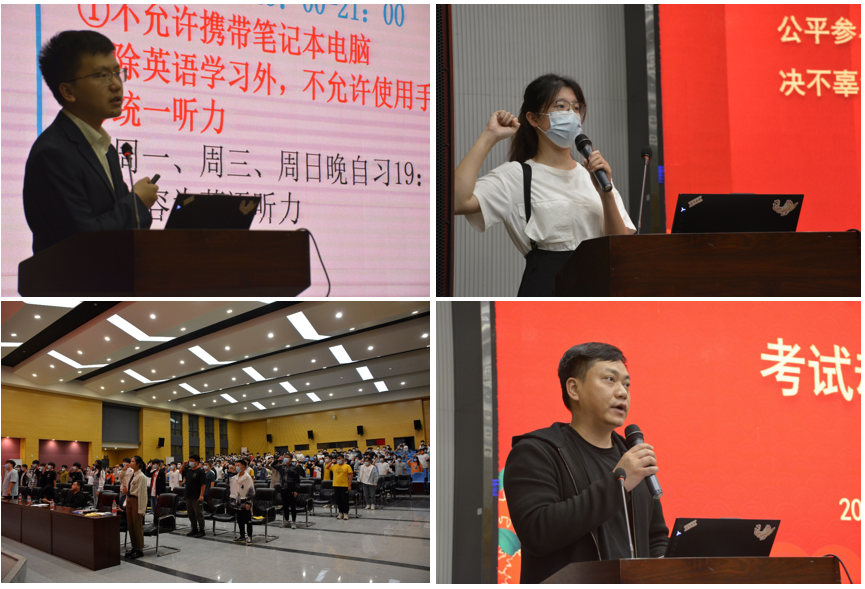 紧接着,21级辅导员张颖旭公布了学院《2021级最新早晚自习管理办法》,并指出早晚自习考勤与综合测评直接关联,呼吁同学们认真对待早晚自习,不要在该奋斗的年龄选择安逸。随后,计科类32102班的高昕同学带领同学们进行了备战四级暨诚信考试宣誓。在同学们高涨的热情中,大会逐渐接近尾声。最后,由学院党委副书记颜学俊宣读《计算机科学学院2021级本科生英语四级奖励办法》并做总结讲话。至此,本次大会圆满结束。