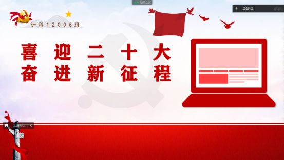 (通讯员 陈智成)为迎接和学习宣传贯彻党的中国共产党第二十次全国代表大会,结合庆祝建党一百周年,着力提升团的引领力、组织力、服务力和大局贡献度,全面深化改革,全面从严治团,不断保持和增强政治性、先进性、群众性。经研究决定在全校范围内开展“喜迎二十大、永远跟党走、奋进新征程”系列主题教育实践活动。计算机科学学院在10月以团支部为单位召开了以此为主题的团会活动,本月示范团支部为计科12006班,团会主题为“喜迎二十大,奋进新征程”,主讲人为该班团支书胡梦婷同学,计科12006班全体同学参加。