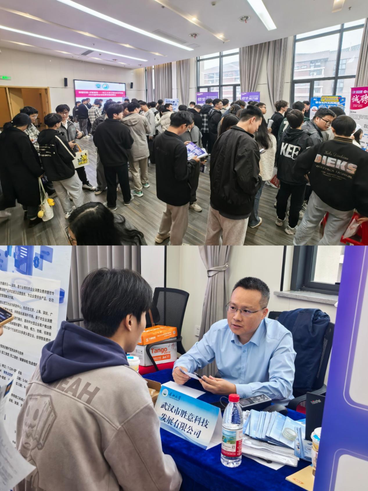 为推动2026届毕业生高质量充分就业,搭建校企精准对接桥梁,11月6日,“数智赋能・才聚荆楚”2026届毕业生秋季校园招聘会成功举办。武汉市胜意科技发展有限公司、恒生电子(武汉)有限公司等13家优质用人单位携岗而来,学院党委书记艾林、毕业年级辅导员张茜、高滢、就业专干王鹏翔、杜琛及2026届毕业生参加招聘会。