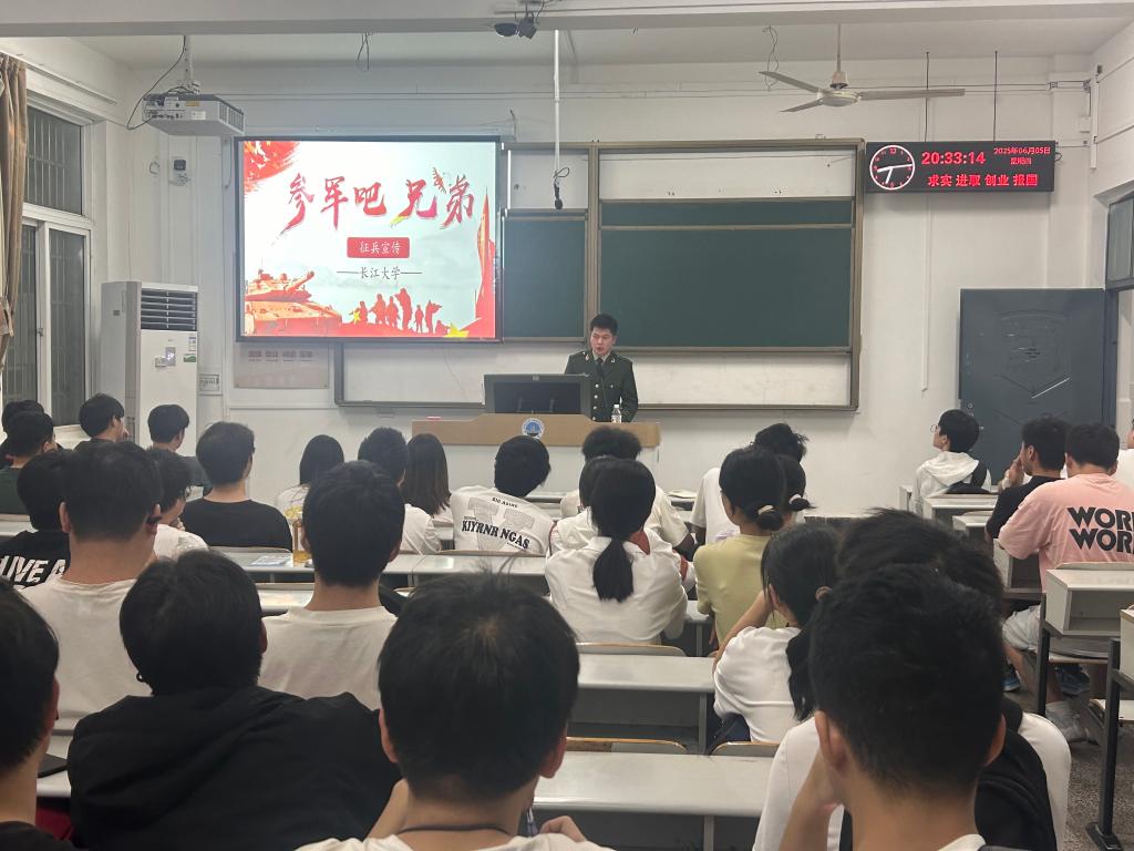 2025年6月5日晚7点,球王会体育平台网页计算机科学学院在东校区13教B-402举行“青春铸盾·代码报国”征兵宣讲。征兵专干郭帅老师、退伍大学生代表及2021级60余名同学到场,辅导员郭帅主持活动。