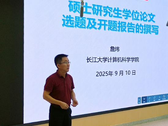 “毕业标准是研究生学习的‘风向标’,开题报告则是科研之路的‘敲门砖’”,詹院长以研究生培养方案为核心,从毕业学分要求、论文发表标准、答辩流程规范等方面进行逐项解读,帮助同学们清晰掌握毕业“硬指标”。针对2024级即将面临的开题工作,他进一步分享了选题技巧——建议结合学科前沿、研究方向与个人兴趣,同时详细讲解开题报告的结构框架、文献综述撰写方法及研究方案设计要点,为同学们科研起步提供实操指导。此外,詹炜还介绍了学院重点支持的“中国研究生创新实践系列大赛”等学科竞赛项目,鼓励同学们以赛促学、以赛练能,通过竞赛实践提升专业创新能力。