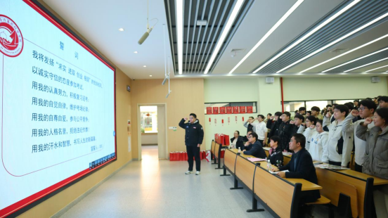 随后,全体考研学子起立庄严宣誓,铿锵有力的誓言回荡在教室中,既表达了对诚信应考的坚定承诺,也展现了决战考研的信心与决心。宣誓完毕,研究生代表李栋结合自身备考经历,为学弟学妹们分享了实用经验。他强调“身体是革命的本钱”,建议学子们在冲刺阶段合理安排作息,注重劳逸结合,保持良好的身心状态;面对压力要及时调整心态,以从容乐观的态度应对备考过程中的困难与挑战;同时鼓励大家“千万不要放弃”,坚持到最后就是胜利,珍惜每一次查漏补缺的机会,全力以赴奔赴目标。